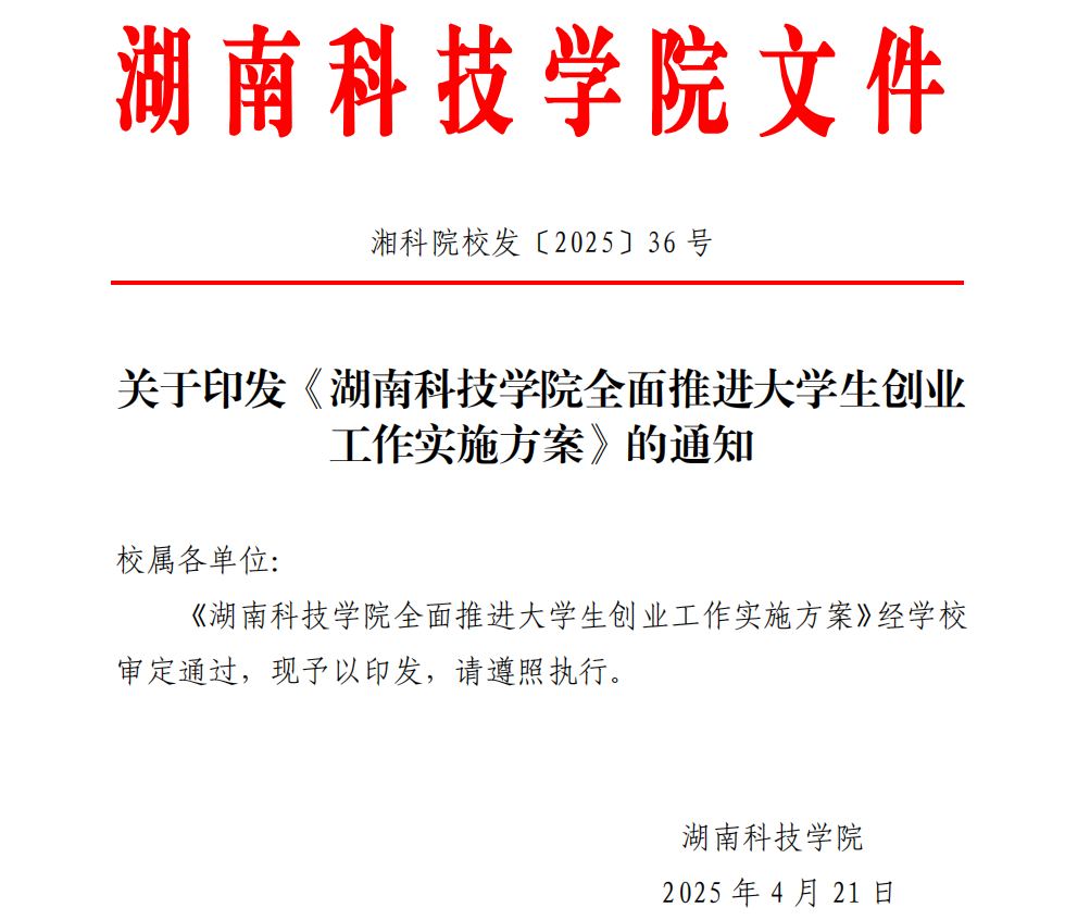 出台《湖南科技学院全面推进大学生创业工作实施方案》等制度10余项,涵盖创业推进、学分认定、奖励激励、成果转化等关键环节。