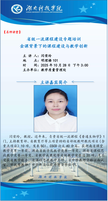 定于10月28日(周二)15:00-16:30在明理楼101召开“省级一流课程建设专题培训”活动,请省级一流课程负者人参加培训活动。