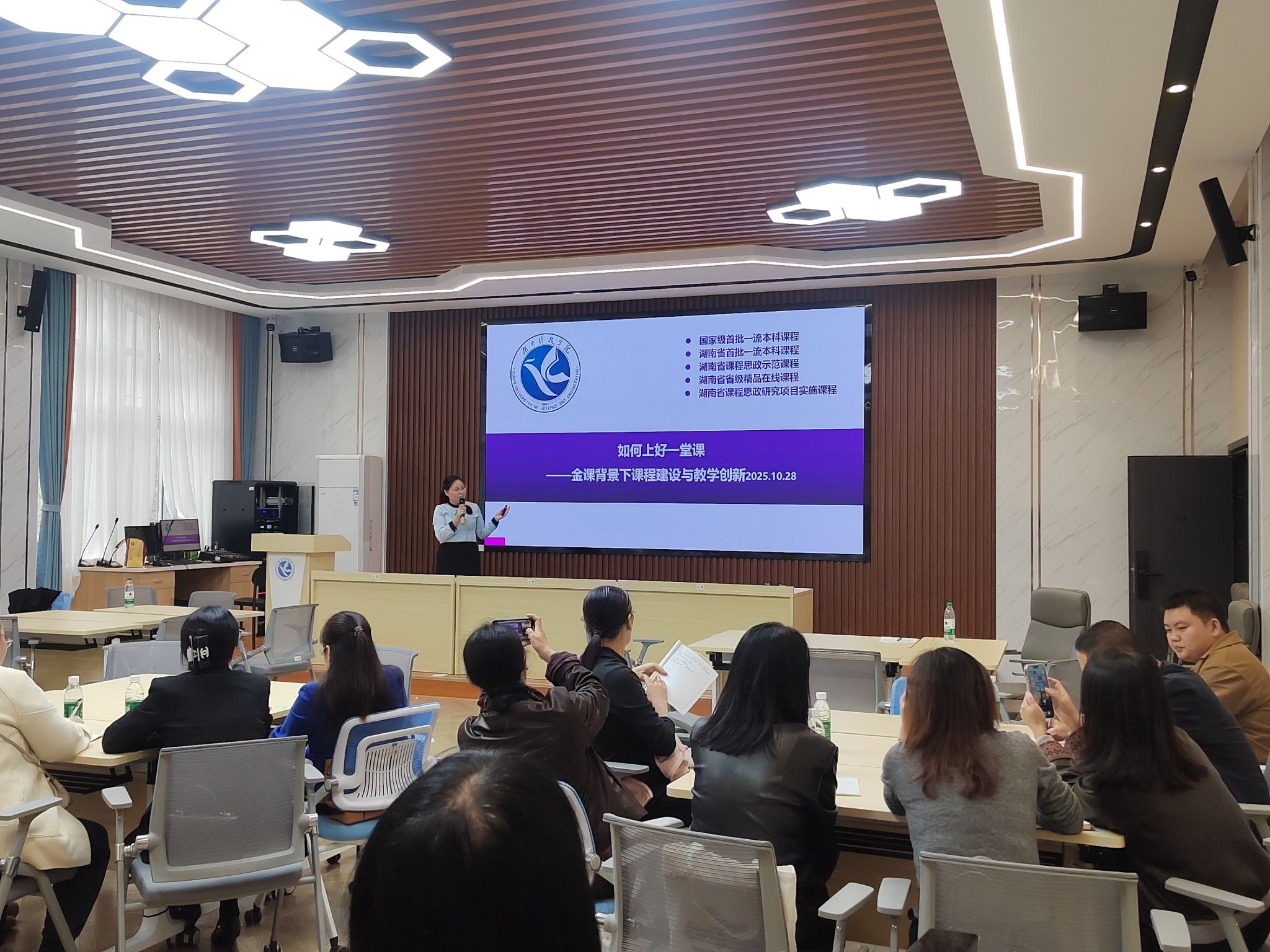 2025年10月28日下午3时,“一流课程建设专题培训”活动在明理楼101召开。活动特邀“湖南科技学院教学名师工作室”成员、省课堂教学竞赛一等奖、省数字化教学竞赛一等奖、省课程思政教学竞赛一等奖、省级教学名师闫荣玲教授主讲,学校国、省级一流课程负者人齐聚现场,共同探讨一流课程建设。