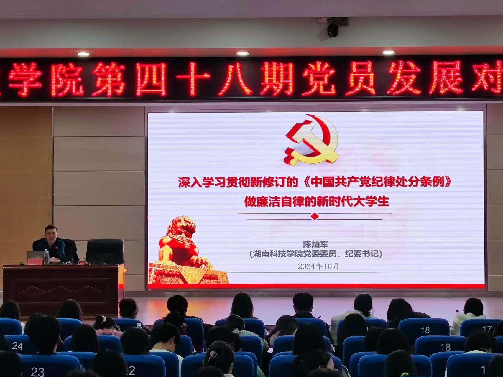为进一步提升党员发展对象的政治素养和党性修养,确保党员队伍的高素质发展,10月29日学校第四十八期党员发展对象培训班在潇湘大讲堂开课。校党委委员、纪委书记陈灿军为党员发展对象上了一堂题为“深入学习贯彻新修订的《中国共产党纪律处分条例》,做廉洁自律的新时代大学生”的生动党课。